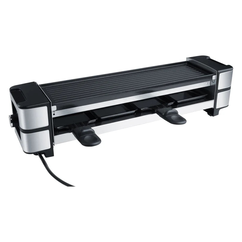 Raclette per un massimo di 4 persone attrezzato con 1 piastra (cm 38,5x11) in alluminio pressofuso con rivestimento in ceramica (priva di PFAS), che garantisce una distribuzione uniforme del calore. La piastra reversibile presenta su un lato una piastra griglia classica e una superficie liscia sull'altro.