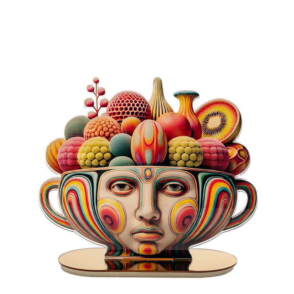 Un centrotavola che inganna l’occhio e sorprende la mente: questa collezione trasforma la tradizione in un gioco visivo e tattile. Le forme tondeggianti, le superfici lisce e le cromie accese evocano un mondo surreale, dove la frutta diventa pura estetica e il design si fa arte.