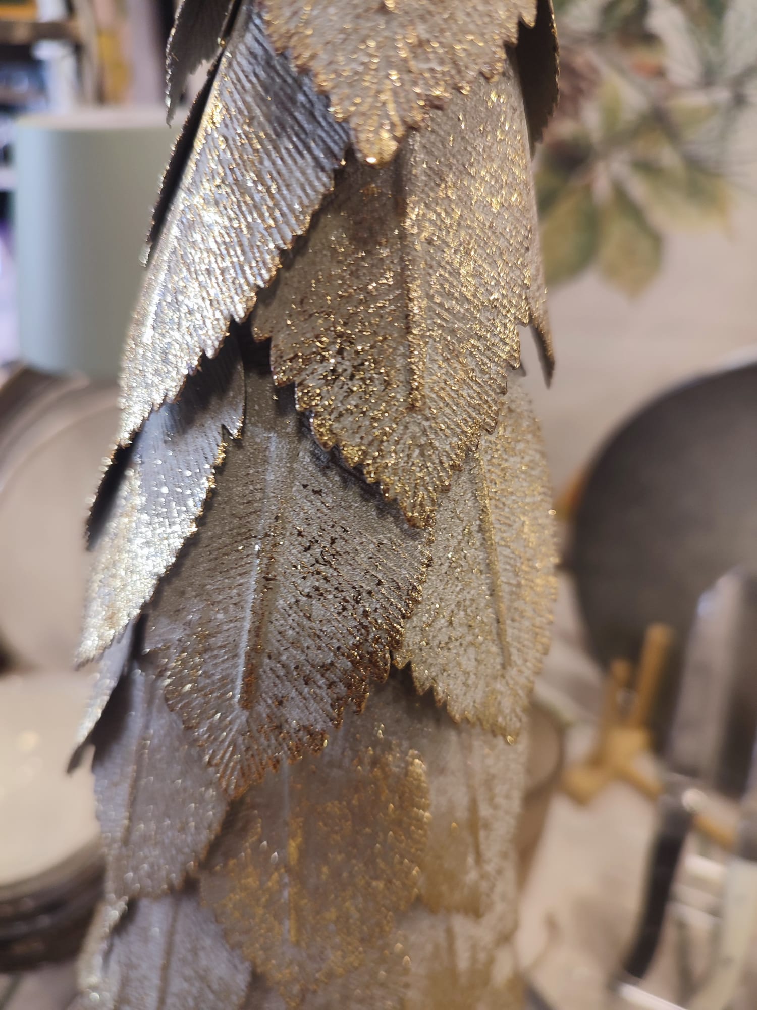Questo affascinante albero natalizio in metallo combina l'eleganza del dorato e dell'argentato in un'unica composizione raffinata. Alto 49,5 cm ( diametro base 15cm), presenta un delicato motivo di foglie che cattura la luce creando giochi di riflessi magici. Perfetto per chi ama uno stile moderno e sofisticato, trasforma qualsiasi ambiente in un'oasi festiva senza occupare troppo spazio. Un tocco di lusso minimalista che celebra il Natale con stile!