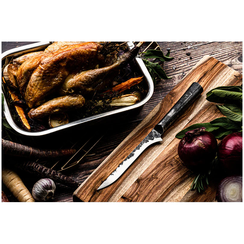 Tutti i coltelli della linea Forged sono forgiati a mano, hanno uno spessore della lama di 2 mm e un angolo di taglio di 18 gradi.I coltelli Brute Forged hanno un bolster aperto, che li conferisce un aspetto eccentrico.